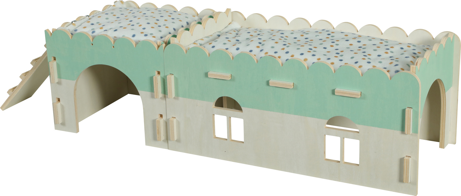 • Een brug van FSC-hout, zodat het konijn zich kan verstoppen of waar het op kan klimmen